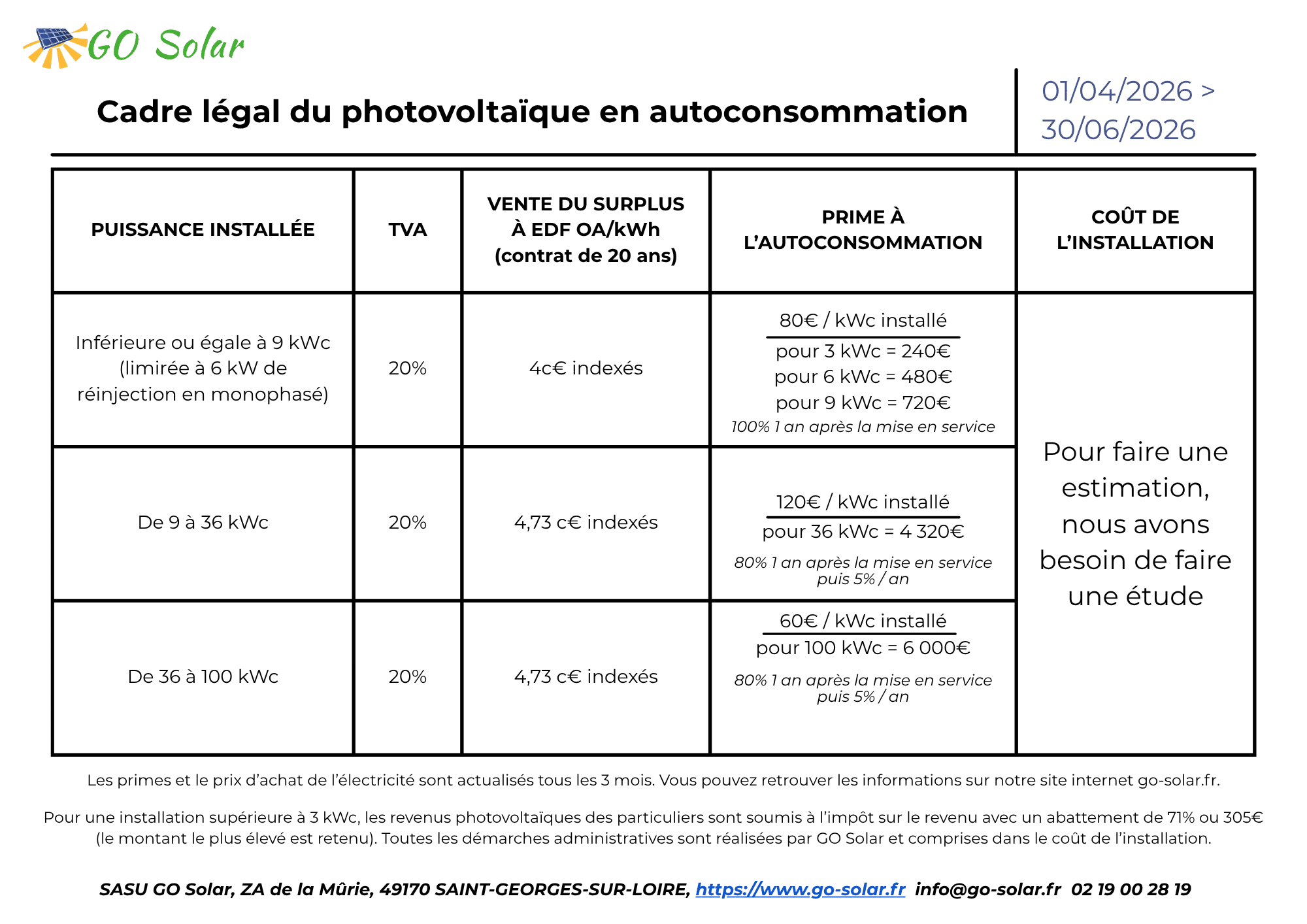 | Puissance installée | TVA | Vente du surplus à EDF OA/kWh | Prime à l’autoconsommation |