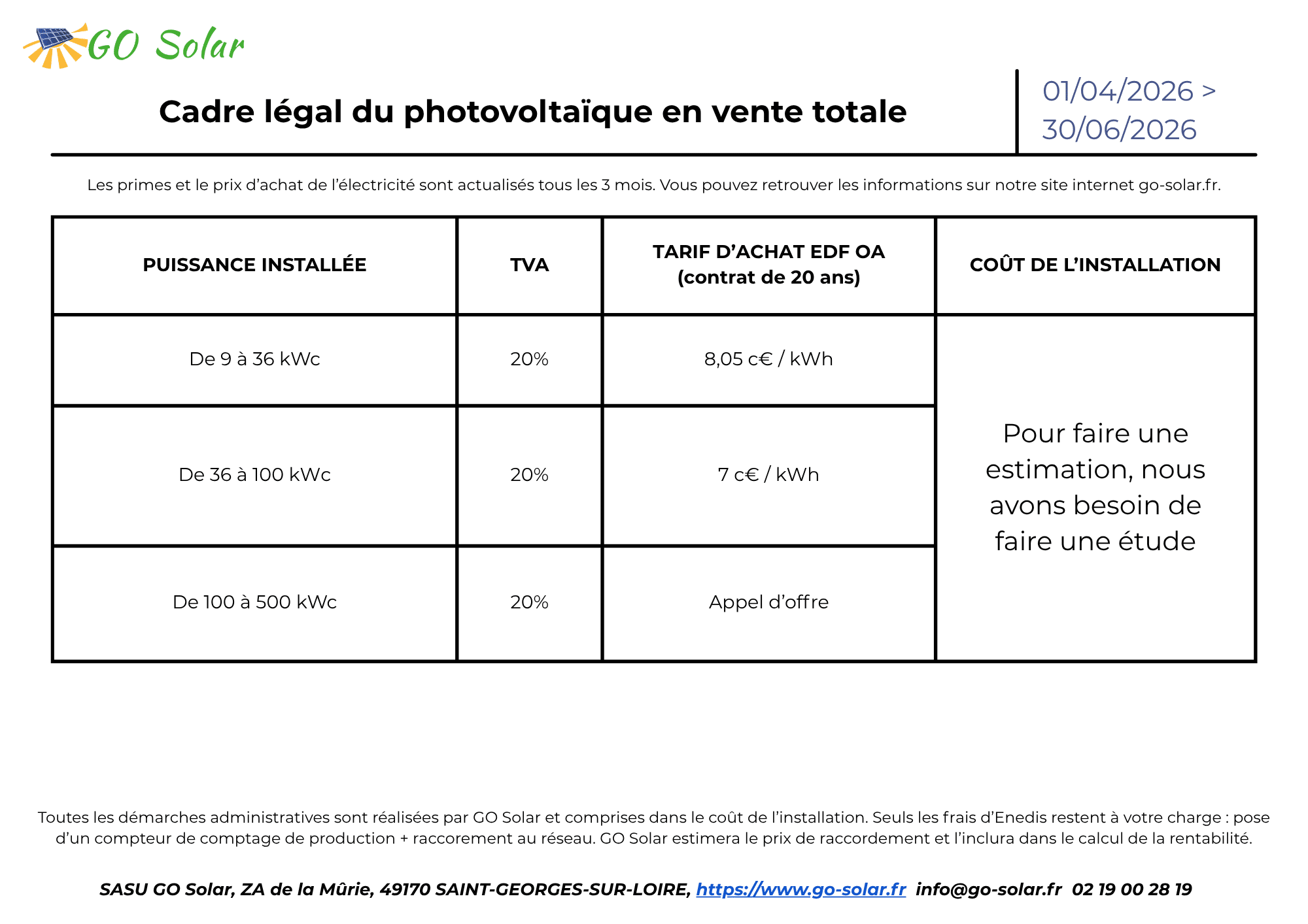 Toutes les démarches administratives sont réalisées par GO Solar et comprises dans le coût de l’installation. Seuls les frais d’Enedis restent à votre charge : pose d’un compteur de comptage de production + raccorement au réseau. GO Solar estimera le prix de raccordement et l’inclura dans le calcul de la rentabilité.